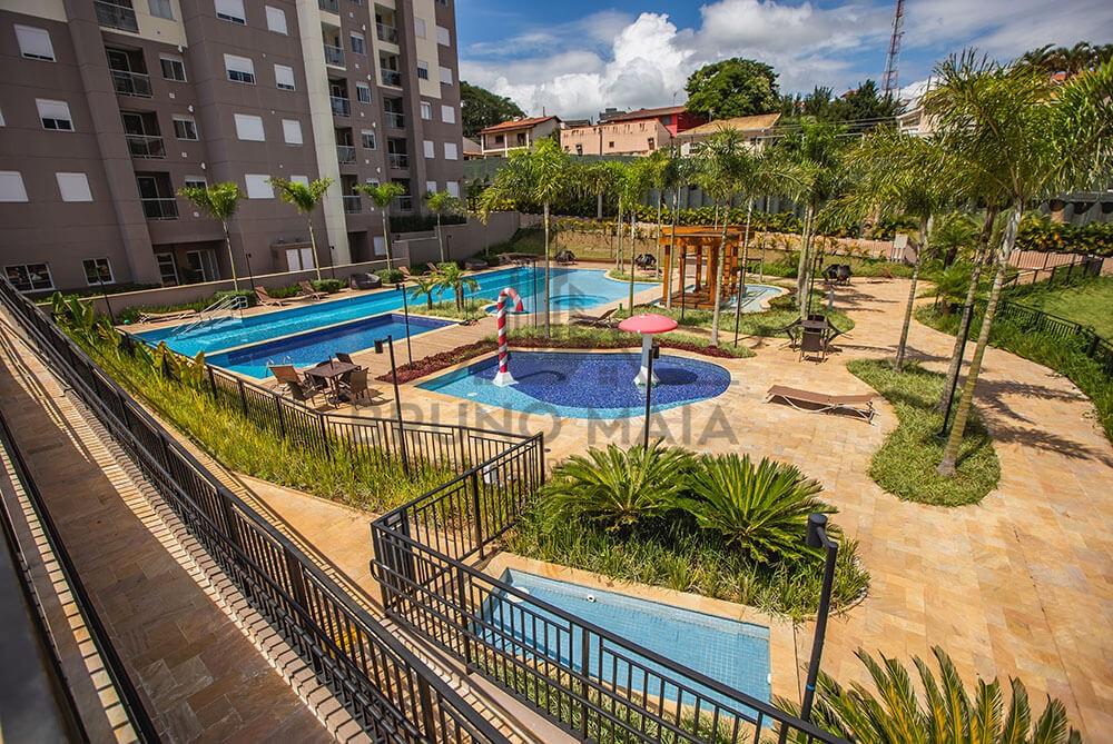 Condomínio com lazer completo, piscina, churrasqueira, salão de festas, academia, brinquedoteca, spa, sauna, portaria e segurança 24h.