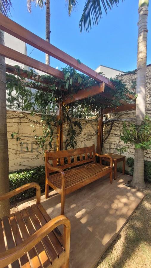Area gourmet fechada com esquadrias em alumínio de correr e ar condicionado e mesa com 8 lugares e ainda conta com um belo jardim com pergolado e moveis de madeira.